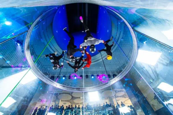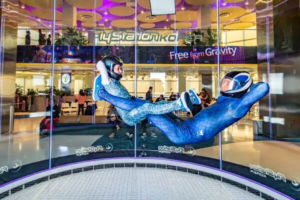 FlyStation Korea is the first commercial indoor skydiving facility in the country. It features the TT45 PRO double loop model by Tunnel Tech, with a 4.5m-diameter flight chamber. The transparent frameless freestanding section comprises 8 meters of chemically strengthened non-shattering glass. Opened in 2019, FlyStation has evolved from focusing solely on indoor skydiving into a leisure and sport centre, offering additional activities such as indoor golf and diving and different eating spots.